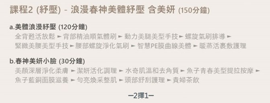 - 單張可1人於《VIVISPA》適用分店使用1或2課程(2擇1)乙次。