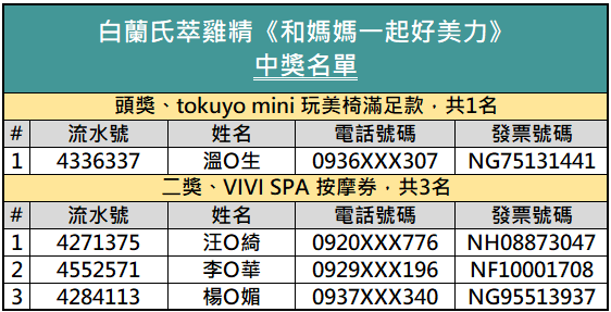 - 得獎者請自行上活動官網站下載領獎信函,將填妥後的「領獎信函」+「中獎發票正本+購買明細」+「身分證正反面影本」,於2023/06/15前(郵戳為憑)以掛號信件寄至104079台北市中山區復興北路368號5樓《白蘭氏活動小組》收,逾期視同自動放棄兌獎資格。