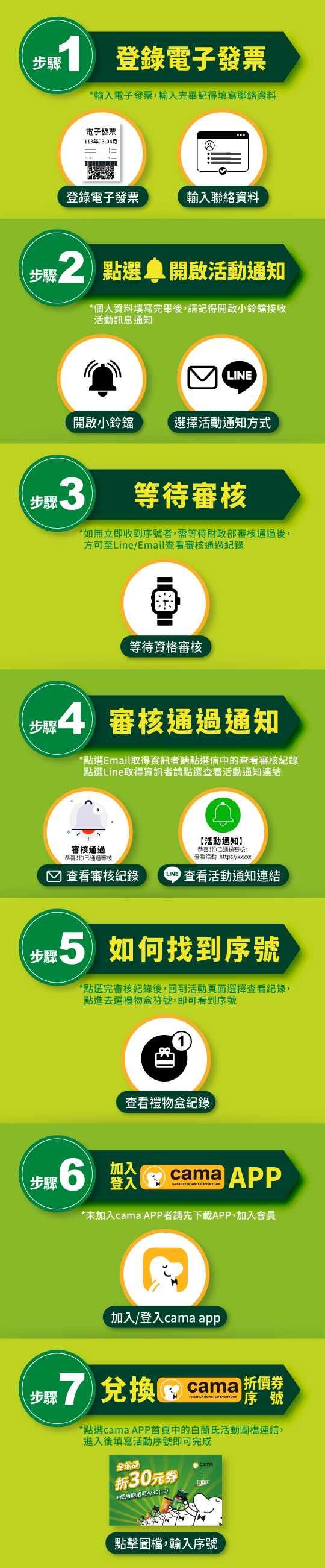 活動期間內至指定通路“單筆購買白蘭氏鷄精系列產品任一件 (不含白蘭氏雞精1入與萃鷄精9入)”,完成登錄發票流程及個人資料,經系統驗證符合參加資格,即可獲得cama café $30元折價券乙張!