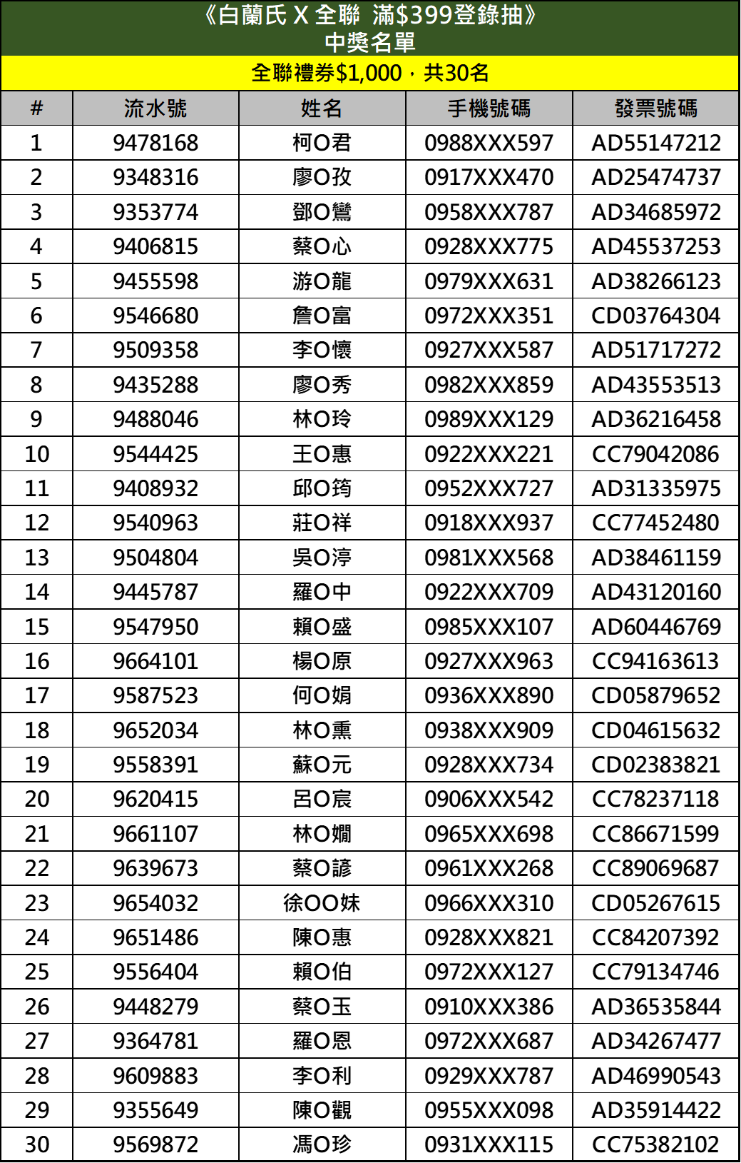 - 中獎者請自行上活動網站下載領獎信函,將填妥後的「領獎信函」+「中獎發票正本+購買明細」+「身分證正反面影本」,於2024/07/30前(郵戳為憑)以掛號或快遞信件寄至104079台北市中山區復興北路368號5樓《全聯-白蘭氏活動小組》收,逾期視同自動放棄兌獎資格。